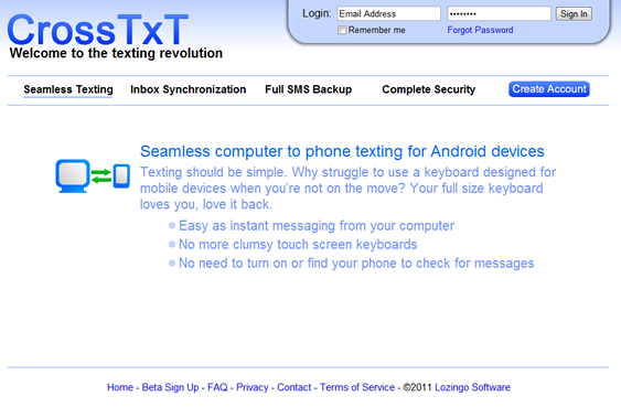 CrossTxT is a cloud‑based text‑messaging system that lets users send texts from any computer with an internet connection. Benefits include sending messages from the user’s phone number, full inbox synchronization between phone and web, and automatic message backups—delivering a truly cloud‑native experience.