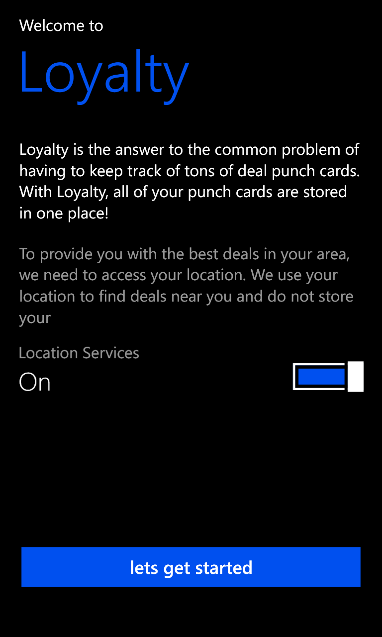Loyalty is a free rewards‑tracking and offers app built by Quinn and Tyler for Windows Phone, backed by an Azure web‑service component. It was designed for local businesses to track customer rewards and publish special offers within the app to attract patrons.
